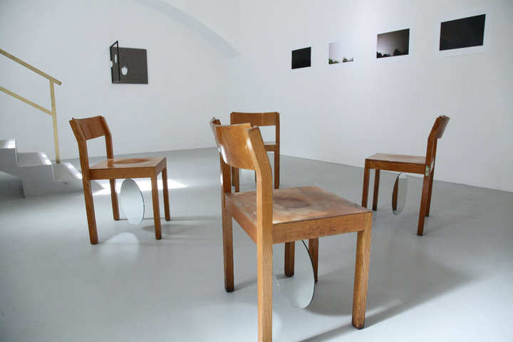 sculptures of stretched fabric and mirrored mobiles hung on the wall, a constellation of Thonet chairs absorbed from the apartment above the gallery and altered with the addition of double-sided mirrors dangling beneath each chair, six attempts to make a digital photo of a mountain landscape in the middle of the night during a lightning storm with the settings on the camera set for daylight conditions, drawings made with a digital camera and the moon, two videos made using sculptures in situ and in a different location altogether.